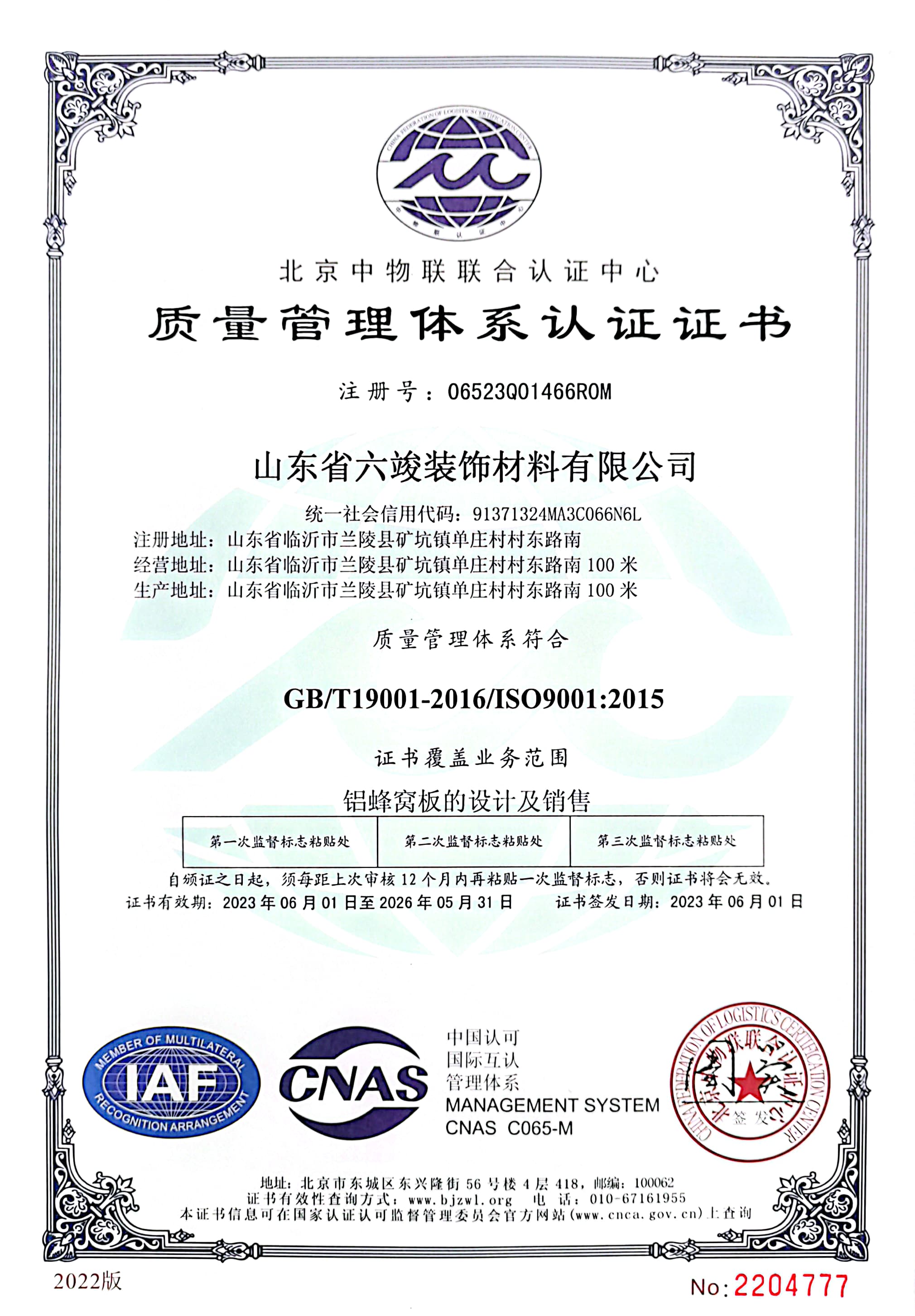 質量管理體系認證證書